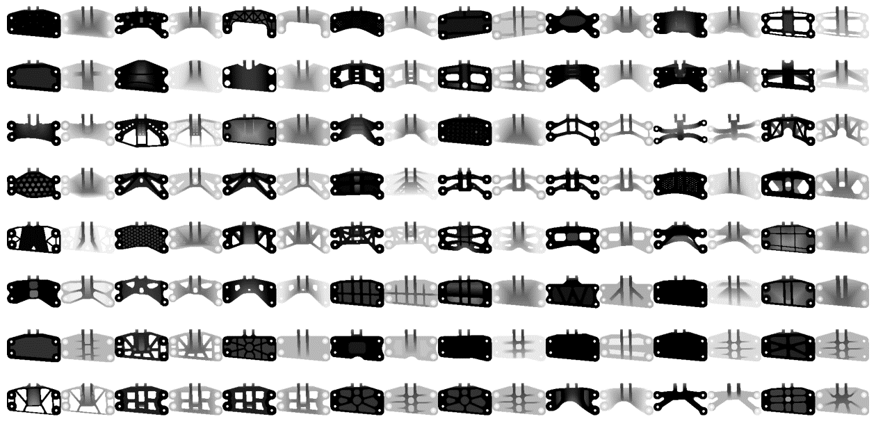 Here are 16 bracket designs generated by the diffusion model—each one is a novel design that never existed in the training data. No cherry-picking was done: these are 16 consecutive samples straight from the model, converted to 3D meshes.
